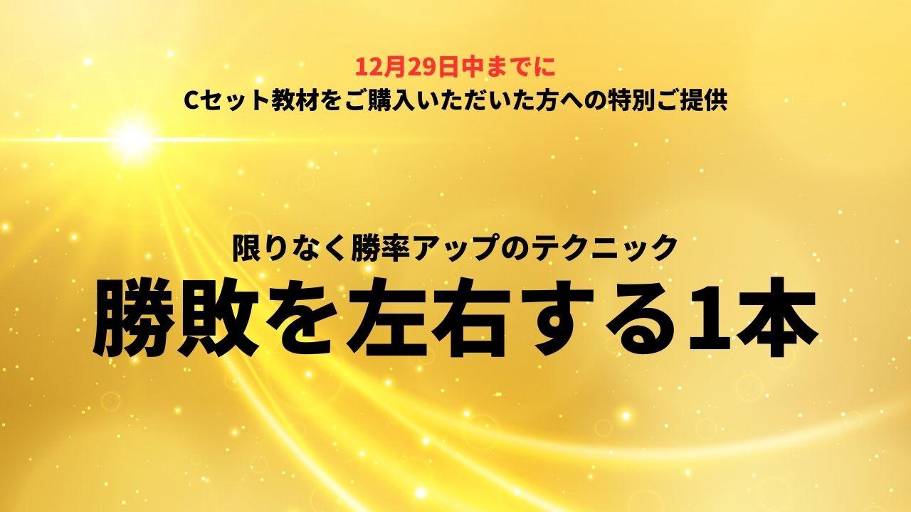 勝率向上策は? 初心者版と上級者版のテクニックを理解いただければ、チャンス場面がかなり増えてきます。 応用力も高まりますので、初心者版をまず理解して、その後で上級者版を理解してくだされば、 鬼に金棒でしょう。 2025年12月29日までのチャンス期間だけの特別なお得セットを必ず入手して下さい。